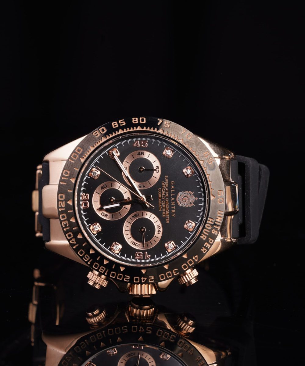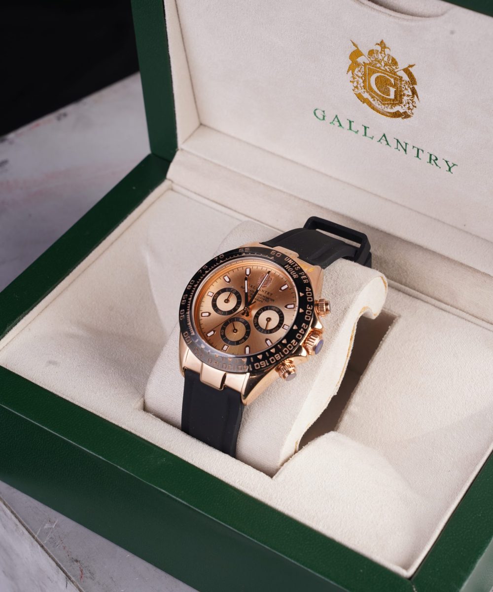 في عالم مليء بالخيارات، ابتكرت جلنتري ساعة إيليت جولد لتكون خيارك الأول. مستوحاة من الفخامة الكلاسيكية لساعات رولكس الشهيرة، مع تحديث عصري يناسب أذواق الجيل الجديد